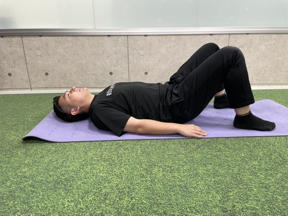 ①両膝を立てて仰向けになり、かかとは膝の真下、かかと幅は坐骨幅にセットします。