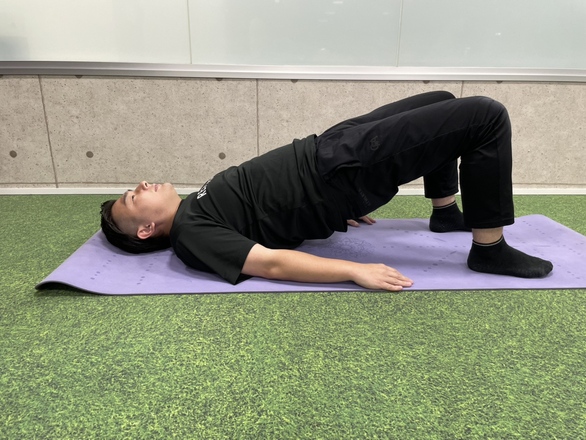 ②両腕は身体の横にハの字に置いておき、息を吐きながらお尻を上げていき、膝から胸までが一直線になるところまで持ち上げます。
