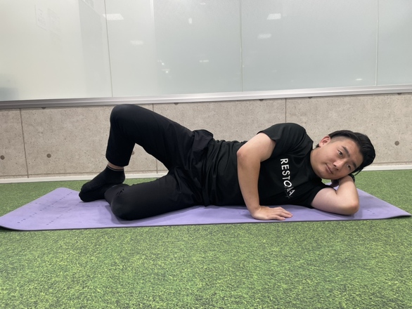 ①横向きで寝て、股関節と膝を45度曲げます。下の腕は腕枕、上の腕は身体の前で支えておくと行いやすいです。