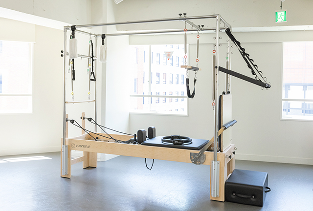 キャディラックは、フレームにスプリングやバーが設置されたマシンで、体を支えながら行うエクササイズや、可動域を意識した動きに用いられます。